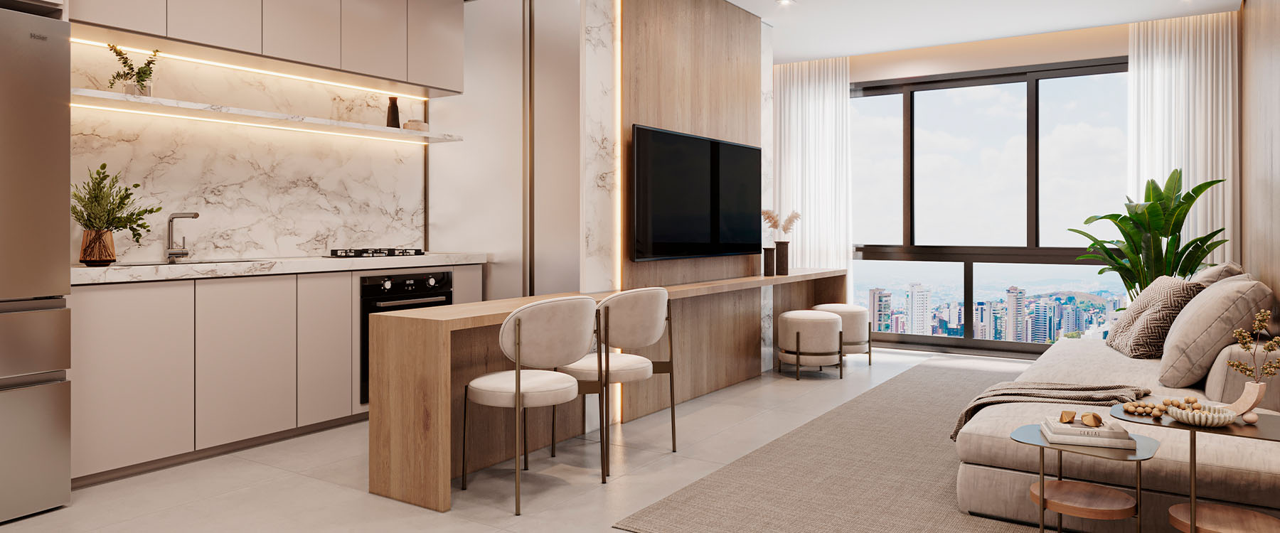 A altitude proporciona uma conexão visual com a paisagem que apartamentos em andares baixos simplesmente não oferecem.